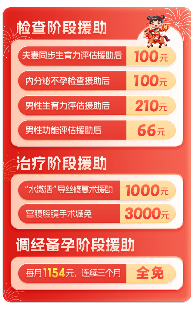 为切实缓解不孕不育家庭的经济负担,郑州慈善总会送子公益基金为来院患者提供“优生及不孕普查保障型援助”和“疑难性不孕深度帮扶服务”。患者只需报名登记,即可通过免申报、直接补贴的便捷服务,实现从检查到治疗的全程守护,让求子之路更宽敞。点击在线咨询,免费申请补助